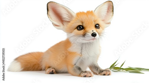 An adorable baby fox with oversized ears sits on a white background looking up inquisitively next to a sprig of greenery.