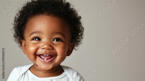 An adorable baby smiling, isolated on a simple background, with no distractions.