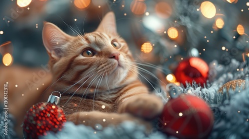 An adorable, cozy Christmas cat happily nestled among cheerful holiday decorations and lights