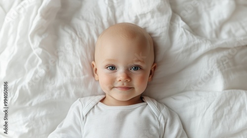 An adorable newborn baby resting on soft white bedding, dressed in a comfortable onesie. The peaceful ambiance highlights the beauty, innocence, and purity of a new life.