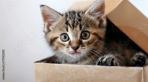 an adorable photograph of a cat comfortably nestled inside a box on a clean white background, highlighting the feline's playful curiosity and love for cozy spaces.