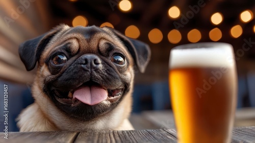 An adorable pug dog with a cute smile, enjoying a refreshing beer in the garden, bringing joy to summer days.