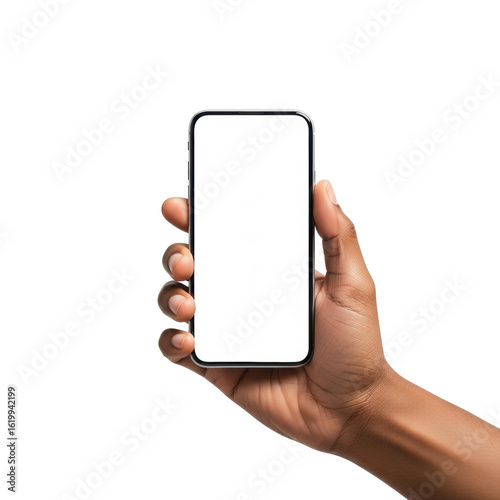 An adult dark-skinned hand holds a modern smartphone vertically with a blank white screen, isolated on a pristine, seamless transparent background with shadowless lighting, UHD product photography