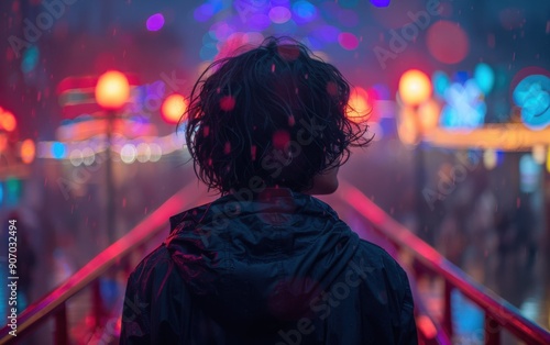 An adult Hispanic person stands in the rain, exploring the colorful lights and attractions of a bustling theme park during the evening
