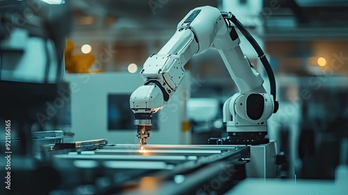 An advanced industrial robot arm performing a task in a high-tech factory, representing innovation in automated systems.