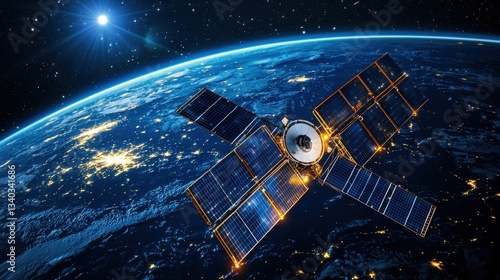 An advanced satellite in Earth s orbit equipped with solar panels transmitting renewable energy from space to power the planet below