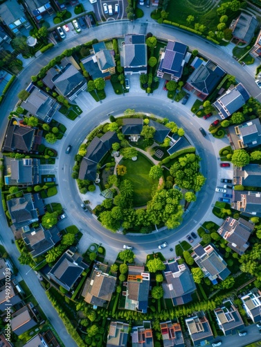 An aerial view of a circular city with lots and trees. AI.