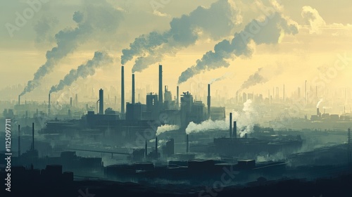 An aerial view of a city engulfed in smog and pollution, with a hazy skyline illustrating the environmental impact of industrialization and global warming