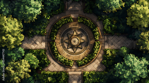 An aerial view of a garden with symmetrical pathways and lush greenery surrounding a central circular patterned feature resembling a sundial or ornamental design. Sundial. Illustration