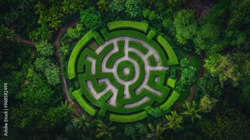An aerial view of a giant hedge maze nestled within a lush garden, showcasing intricate paths winding through tall, well-manicured greenery.