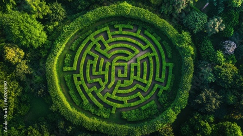 An aerial view of a giant hedge maze nestled within a lush garden, showcasing intricate paths winding through tall, well-manicured greenery.
