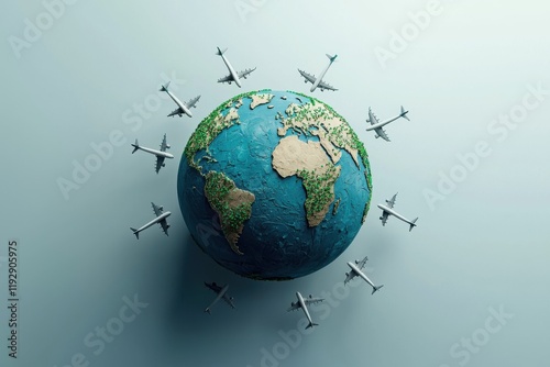 An aerial view of a globe surrounded by multiple airplanes, symbolizing global travel and connectivity