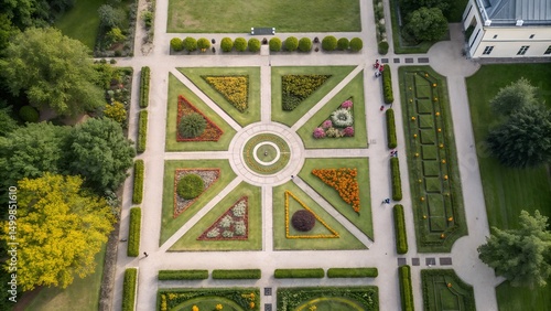 An aerial view of a meticulously designed formal garden featuring geometric patterns of pathways, lawns, and vibrant flower beds surrounding a central circular element