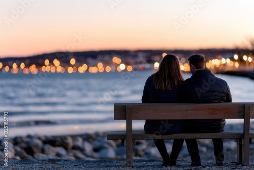 An affectionate couple shares a quiet moment on a bench by the water, with soft waves and dreamy city lights blending together in the evening ambiance.
