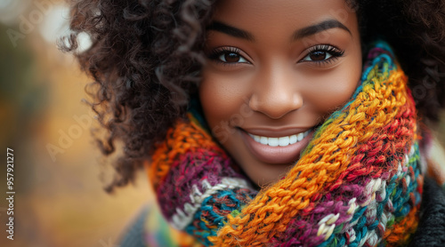 an afroamerican woman with multicolor scarf, medium smile, autumn concept