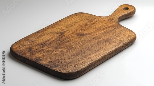 An aged wooden cutting board, showcasing its unique wood grain and rustic charm, rests on a neutral surface, ready for culinary preparations or serving delights.