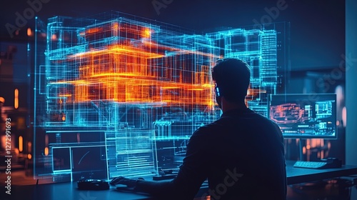 An AI architect designing a glowing holographic blueprint of a futuristic building