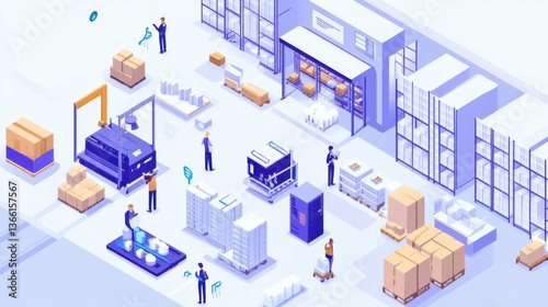An AI powered system tracking and managing inventory in an e commerce warehouse, bustling warehouse with real-time stock data and automated sorting, Logistics technology style