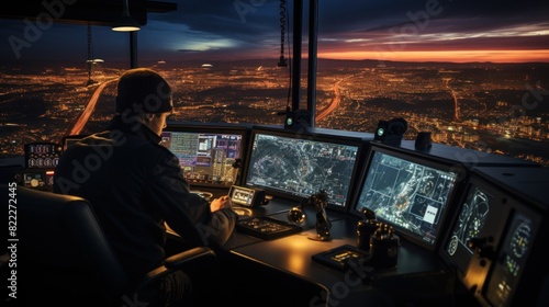 An air traffic controller at work during twilight, overlooking a cityscape from the control tower