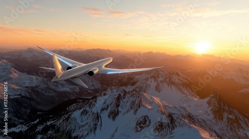 An aircraft elegantly flies over mountain peaks during a vibrant sunset, capturing the awe-inspiring beauty of nature and symbolizing freedom and global connection.