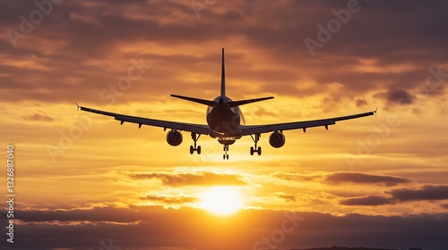 An airplane flying through vibrant sunset skies with clouds creating a dramatic backdrop of colors : Generative AI