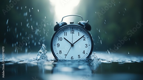 An alarm clock partially submerged in water, surrounded by splashes, creating a serene yet intriguing atmosphere.