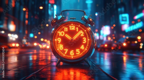 An alarm clock sits on a city street at night, with the glowing neon lights reflecting on the wet pavement.