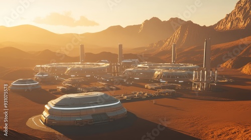 An alien city thrives in the main square filled with various creatures and technological marvels as sunset casts a warm glow over the landscape