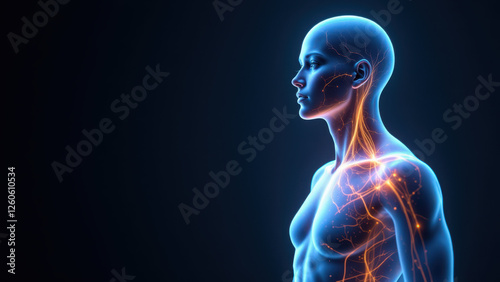 An anatomical representation showing VNS (Vagus Nerve Stimulation) with highlighted nervous system pathways.