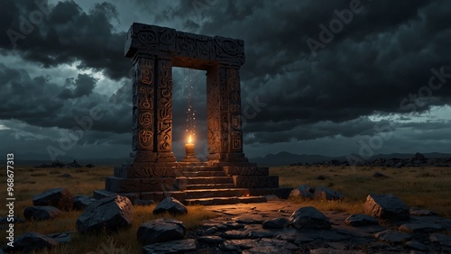 An ancient altar made of black stones, surrounded by glowing runes, set against a stormy sky backdrop.
