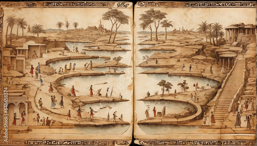 An ancient depiction on aged papyrus portraying the bifurcation of life's journeys in the context of ancient mythology delineated into distinct segments - AI Generative