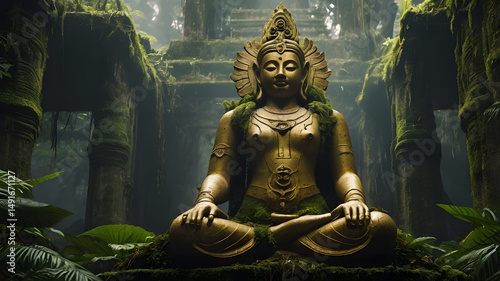 An ancient golden deity seated in a rainforest temple, overgrown with vines and moss, eyes glowing faintly.
