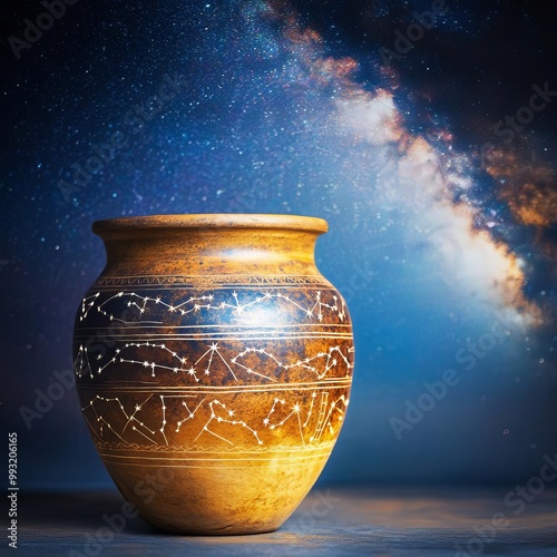 An ancient pottery jar with etched patterns of constellations, shimmering under a night sky, representing ancient astronomy