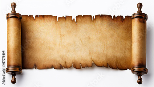 An ancient scroll in a horizontal position, unrolled on a white background.