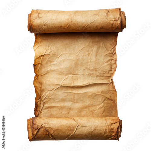 An ancient scroll with a textured surface, featuring rolled ends and a weathered appearance, indicative of historical significance.