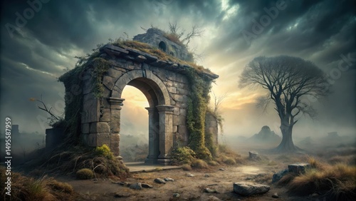 An ancient stone archway, overgrown with vegetation, stands solitary in a misty field at sunset, a pathway leading towards a mysterious horizon.