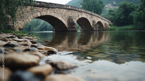 An ancient stone bridge reflects gracefully in the still river, embraced by lush nature and a serene atmosphere.