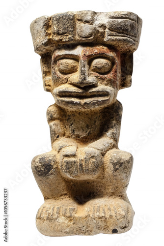 An ancient stone statue of a deity, carved in intricate detail, isolated on transparent or white background