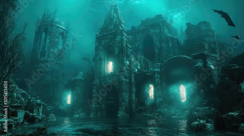 An ancient underwater city with mysterious structures and glowing lights, revealing the beauty of deep ocean exploration.