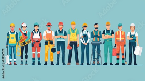 An animated group of construction workers with various tools standing together, symbolizing unity, teamwork, and dedication in the construction industry.