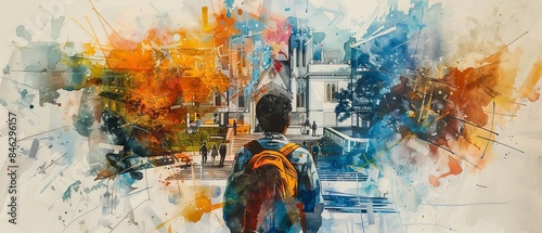 An annual publication cover featuring a high-angle view of academic memories, blending traditional watercolor elements with digital techniques for a unique and artistic flair