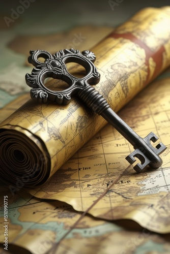An antique key rests on a rolled-up vintage map with geographical details and visible text.