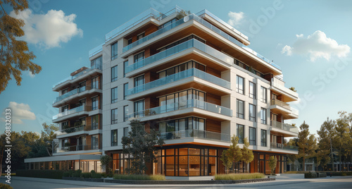 An apartment building with a white facade, glass and wood elements, balconies on the first floor for shops, modern architecture, a city center location. Generative AI.