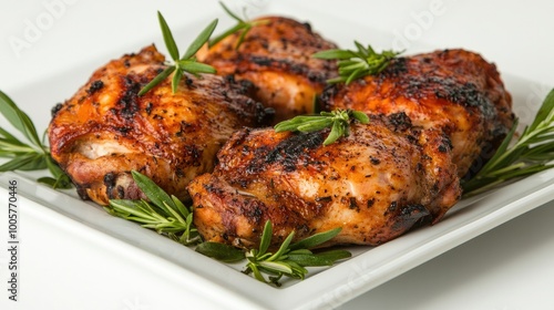 An appetizing plate of fire-roasted chicken thighs, garnished with fresh herbs and spices, set against a clean white background for a rustic appeal.