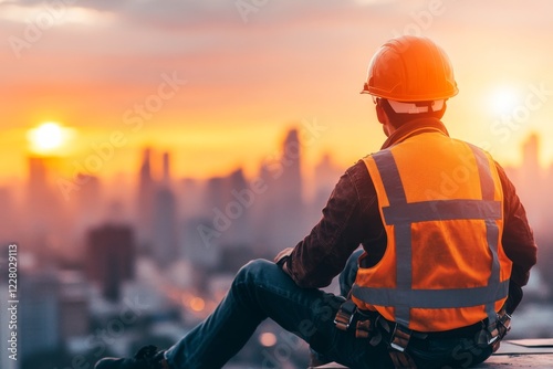 An architect on a rooftop, overseeing the skyline of a city and the progress of ongoing construction