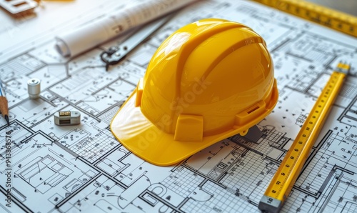 An architectural blueprint lies on a clean table, accompanied by a vibrant yellow safety helmet and a pencil. The intricate design illustrates the planning stage of a construction project