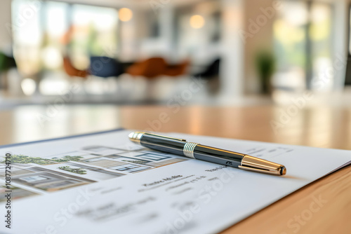 An architectural plan and a sleek pen rest on a wooden desk in a bright office
