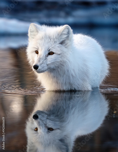 An arctic fox with thick white fur cautiously steps on the icy surface near a reflective pool of water, surrounded by snow and cold tranquility.