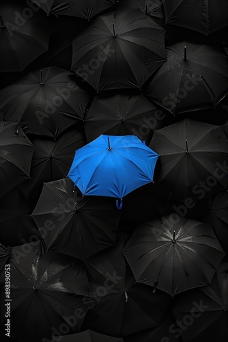 An array of black umbrellas with a single blue umbrella in the center, creating a striking contrast against a dark background.