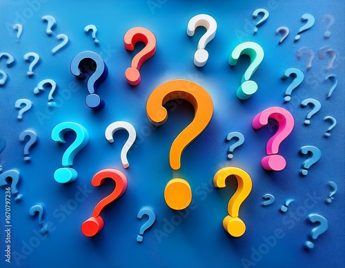 an array of colorful 3d question marks dynamically arranged against a blue background evoking ideas of uncertainty creativity and the vast possibilities of inquiry